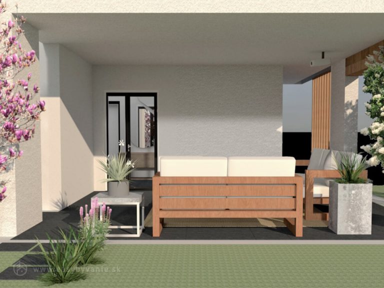 terasu, ktorá sa nachádza na streche garáže. Z haly je riešený vstup do kúpeľne s WC, do technickej miestnosti, výstup na zadnú krytú terasu a vstup na schodisko, ktoré vedie na 2.NP. Na 2.NP sa nachádzajú tri izby, kúpeľňa, šatník a balkón.
